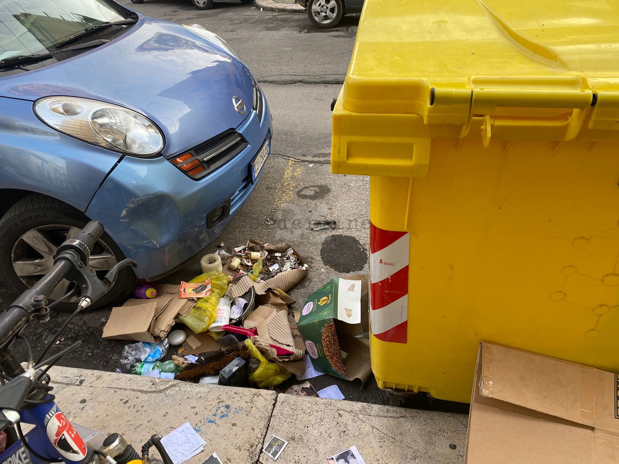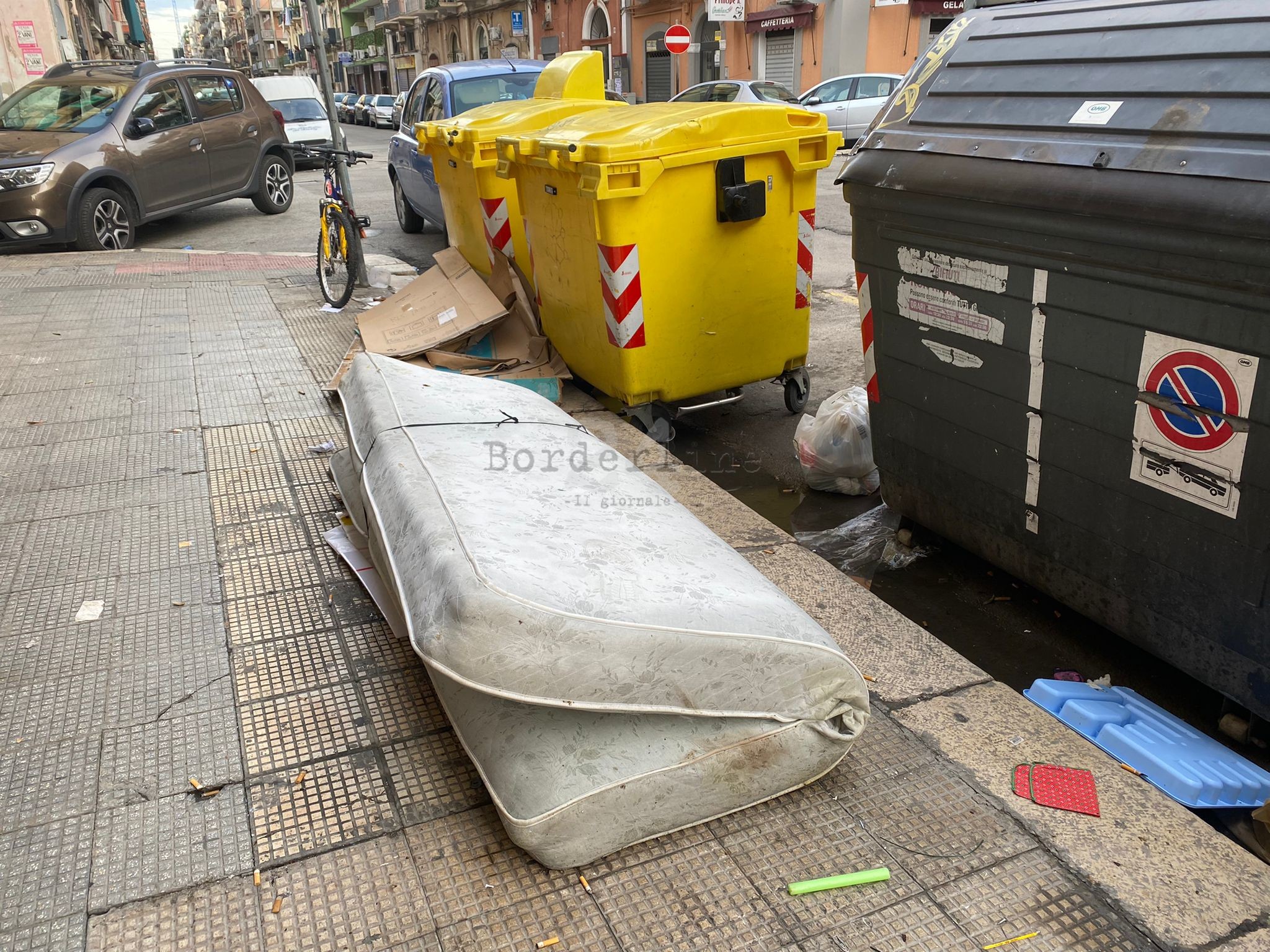 Tra i rifiuti (foto in basso), è possibile trovarci di tutto. Alcune delle buste sono state posizionate all’esterno dei bidoni e, nel giro di poco tempo, sono diventate “parte integrante” della strada, ricoprendone alcune parti. Ci sono poi plastica e cartoni abbandonati praticamente all’esterno dei bidoni. Spicca infine, in particolare, il materasso rilegato e abbandonato sul marciapiede che “non permette a pedoni, persone in sedia a rotelle o mamme con carrozzina” di transitare regolarmente.