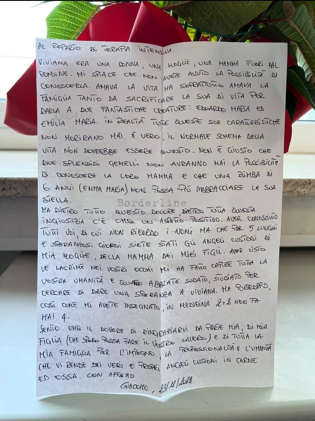 Una lettera rivolta a tutti i medici e gli operatori sanitari che si sono mobilitati per salvare sua moglie. È quella che Giacomo, il marito di Viviana Delego, morta tragicamente dopo aver partorito due gemelli, ha voluto consegnare al reparto di terapia intensiva e che l’Asl di Brindisi ha voluto pubblicare sui propri social.
