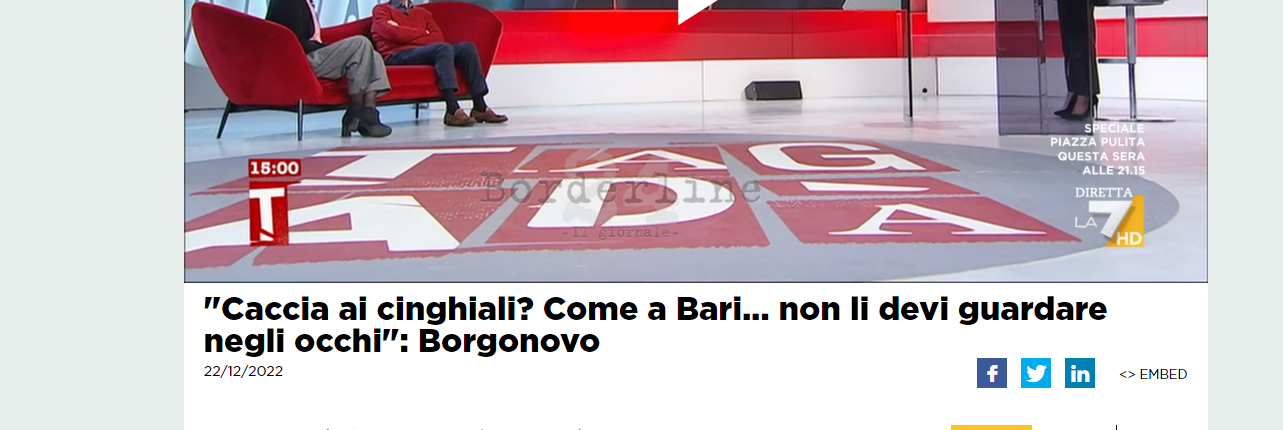 Dietro la frase pronunciata dal giornalista Francesco Borgonovo a Tagadà il 22 dicembre scorso (ed ancora in bella vista sul sito di La7 come nello screenshot sotto) ci sarebbe solo un equivoco. E’ lo stesso giornalista a rivelarlo in un tweet. “E’ successa una cosa stranissima e surreale – spiega – ho cominciato a ricevere messaggi e email da alcune persone che mi seguono o altri che hanno visto questa cosa online. Pare che abbia attaccato la città di Bari e i suoi abitanti. Clamoroso fraintendimento. Io l’altro giorno ho partecipato ad una trasmissione su La7 Tagadà, durante la quale si è discusso di varie questioni, tra cui la presenza di cinghiali. Io non dico Bari, ma al bar. Sul sito di la 7 è stato citato questo spezzone dicendo Bari, ma si tratta di un errore. So che il sindaco Decaro ha risposto e lo ringrazio ed è stato cortese. Approfitterò per venire a Bari a trovarlo, ritengo che sia una bellissima città. Nulla contro i baresi, solo un equivoco”.