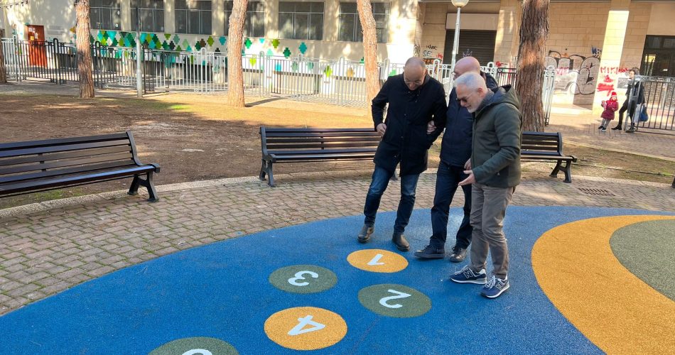 L’assessore Giuseppe Galasso, in compagnia dei consiglieri della commissione Lavori pubblici del Municipio II, si è recato questa mattina nel giardino Chiara Lubich, a Carrassi, dove è stata riaperta al pubblico l’area giochi centrale in cui è posizionata l’attrezzatura ludica. Il vecchio gioco è stato infatti sostituito con uno nuovo, costituito da un castello composto da diversi scivoli, arrampicate, percorsi interni e altri manufatti ludici. Contestualmente è stata anche collocata la nuova pavimentazione antitrauma, su cui è raffigurato anche l’antico gioco della campana.