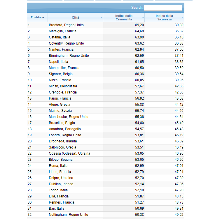 In classifica generale, quattro città francesi e tre inglesi sono state classificate nelle 10 città più pericolose d’Europa. Secondo il parametro del “crime index”, la città più pericolosa è Bradford in Inghilterra, accompagnata in top 10 da Coventry e Birmingham. Per quanto concerne le altre italiane, Napoli si posiziona al 7° posto, Roma al 24°, Torino al 28°, Bari al 31° e Milano al 36° su 152.