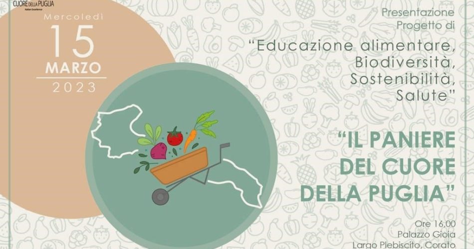 Mercoledì 15 marzo 2023, alle 16 a Corato, si terrà l’incontro di presentazione del Progetto “Il Paniere del Cuore della Puglia”, promosso dall’Associazione “Cuore della Puglia”, che coinvolge i nove comuni della Provincia di Bari tra cui Gravina. L’iniziativa rientra nelle attività cofinanziate dalla Regione Puglia – “Programma di Promozione dei prodotti agroalimentari pugliesi di qualità ed educazione alimentare – Annualità 2022-2023”.