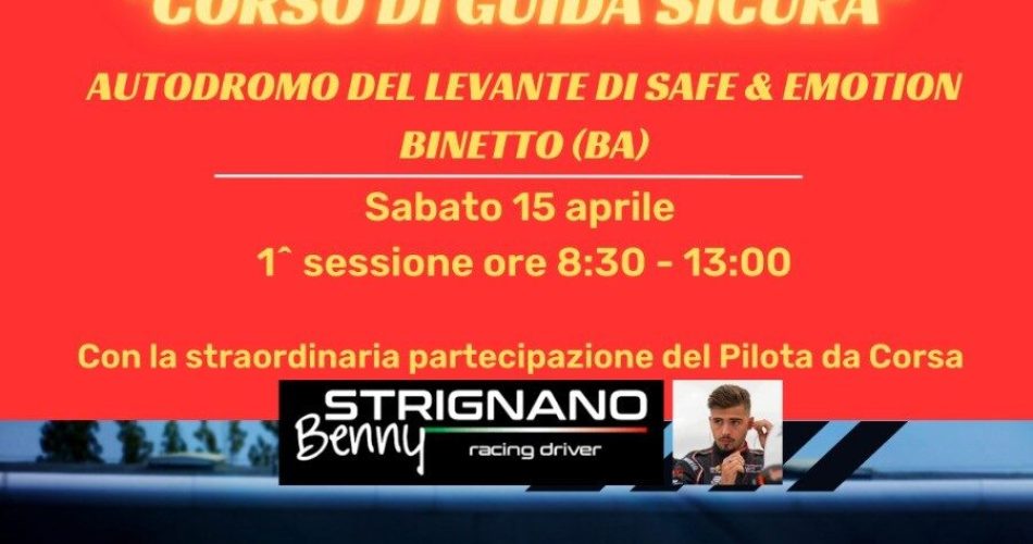 Sabato 15 aprile, a partire dalle ore 9, presso l’autodromo del Levante di Binetto, si terrà un “corso di guida sicura” al fianco di istruttori federali Aci di Vallelunga. L’evento, realizzato su iniziativa del Rotary Club Bari Mediterraneo e supportato dall’Ac Bari Bat, con un testimonial d’eccezione, il pilota della Porsche Carrera Cup Italia, Benny Strignano, vedrà coinvolti, in totale, 50 ragazzi e ragazze dai 18 ai 25 anni.