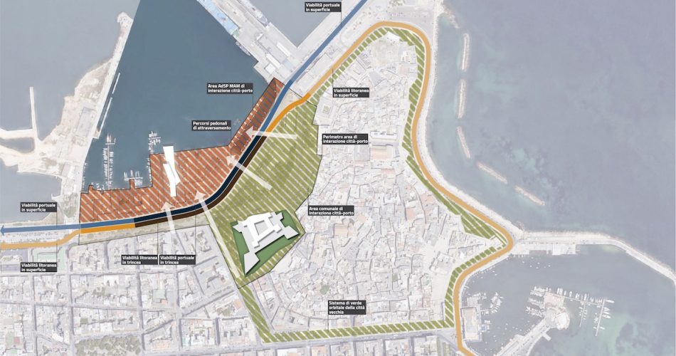 Il parco del Castello rappresenta un progetto molto più ampio promosso dall’omonimo comitato che aveva tra i soci fondatori l’architetto, scomparso nel 2021, Arturo Cucciolla. Un progetto che prevede la pedonalizzazione di tutta l’area attorno al Castello Svevo, creando appunto un grande parco, che però attende ancora i finanziamenti per poter partire almeno con le progettazioni. Il progetto complessivo è da 53 milioni di euro. Il primo finanziamento è arrivato e riguarda due interventi che saranno curati dall’Autorità portuale: il primo è la ridefinizione e il banchinamento dello specchio acqueo interno alla “darsena vecchia”, necessario per riqualificare un ambito portuale sottoutilizzato e per ridisegnare la viabilità portuale e le relative connessioni con la città. Il secondo intervento, invece, prevede l’interramento della rete stradale portuale, per un tratto di circa 600 metri, in affiancamento al sistema viario cittadino che verrà quindi spostato nell’area portuale, favorendo la connessione tra castello, aree verdi esistenti e aree portuali.