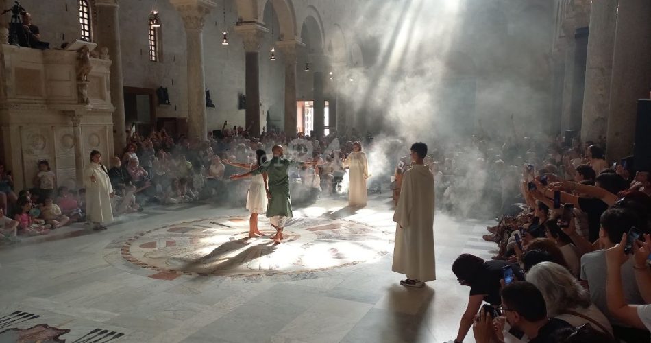 Anche quest’anno, a Bari, si è ripetuta la magia del solstizio d’estate con il consueto appuntamento in Cattedrale. Il rosone della facciata da cui si proietta la luce del sole, intorno alle 17.10, ha combaciato perfettamente con il rosone sul pavimento davanti l’altare maggiore. Tantissima la gente presente in Cattedrale: molti fedeli e anche turisti.