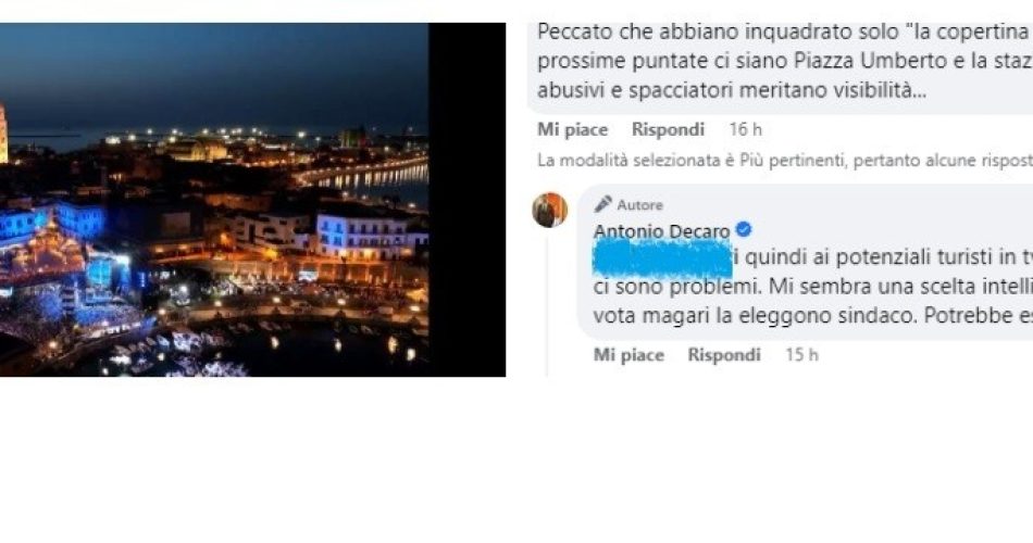 “Peccato che abbiano inquadrato solo “la copertina del libro”… Speriamo che nelle prossime puntate ci siano piazza Umberto e la stazione, anche i nostri parcheggiatori abusivi e spacciatori meritano visibilità”, scrive un cittadino. Pronta la replica del sindaco. “Quindi ai potenziali turisti in tv – scrive Decaro – dovremmo far vedere le zone dove ci sono problemi. Mi sembra una scelta intelligente. Guardi l’anno prossimo si vota magari la eleggono sindaco. Potrebbe essere la svolta per Bari città turistica”.