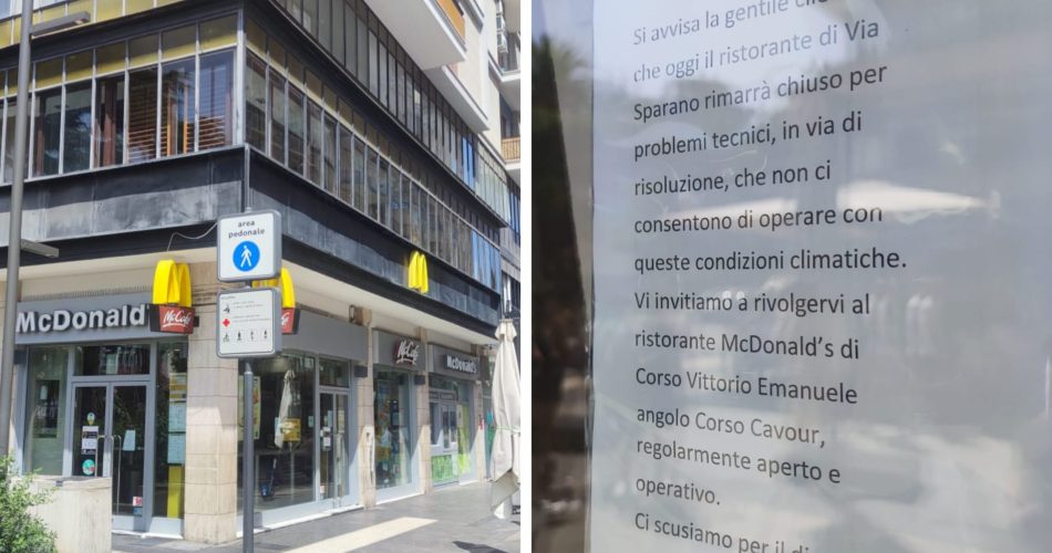 “Grande soddisfazione per la decisione aziendale di chiudere al pubblico il locale Mc Donald’s di via Sparano per ragioni tecniche che non consentono il lavoro alle attuali temperature”. Lo annuncia Antonio Miccoli della Filcams CGIL Bari. “Dopo la dichiarazione di sciopero dei lavoratori, l’azienda ammette le temperature proibitive all’interno del ristorante e da ragione al sindacato.Si resta chiusi in via Sparano perché le temperature non consentono il lavoro in condizioni di sicurezza”, commenta Miccoli.
