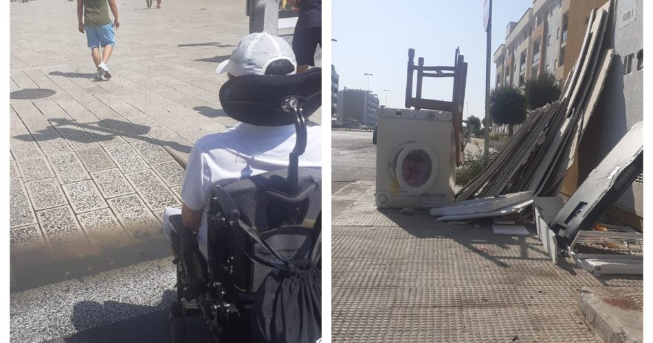 “Qualcuno ha deciso di scaricare i residui di un lavoro di una casa presso i bidoni lí vicino – continua il racconto – incurante che lì c’è una discesa per disabili… e niente, non mi abbatto, vado avanti, sono costretto a camminare sulla strada, schivando le macchine che percorrono via Conenna… Mi avvicino al bus, chiedo all’autista di aspettarmi, devo raggiungere l’altra discesa per disabili che sta in fondo al marciapiede, c’è sempre il sole e fa sempre caldo… Arrivo alla discesa, finalmente questa è libera, ci salgo e devo raggiungere il bus”.