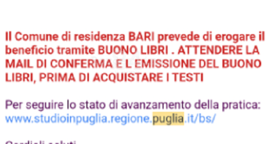 Il Comune di Bari ha aperto la possibilità di richiedere buoni libro per le scuole secondarie di primo e secondo grado. “Anche quest’anno, per gli studenti residenti a Bari che frequentano le scuole secondarie di 1° e 2° grado, abbiamo confermato l’opzione dei buoni libro digitali da ottenere inviando istanza sulla piattaforma regionale dedicata – aveva commentato l’assessora alle Politiche educative e giovanili Paola Romano – e da spendere poi in una delle librerie o cartolibrerie iscritte all’albo comunale. In questo modo le famiglie non dovranno attendere l’attribuzione del buono materiale da parte delle scuole, ma potranno recarsi autonomamente con il codice pratica ottenuto nella libreria scelta. Anche quest’anno abbiamo chiesto alle librerie e alle cartolibrerie di avere una sede fisica per sostenere le realtà presenti sul nostro territorio”. “Il buono libro digitale (sotto forma di codice) sarà automaticamente disponibile solo a seguito della ricezione, via mail, della conferma dell’ammissione al contributo”, si leggeva in un comunicato. Il problema è che questa mail di conferma a molti non è ancora arrivata, ed è necessaria per richiedere i testi scolastici.