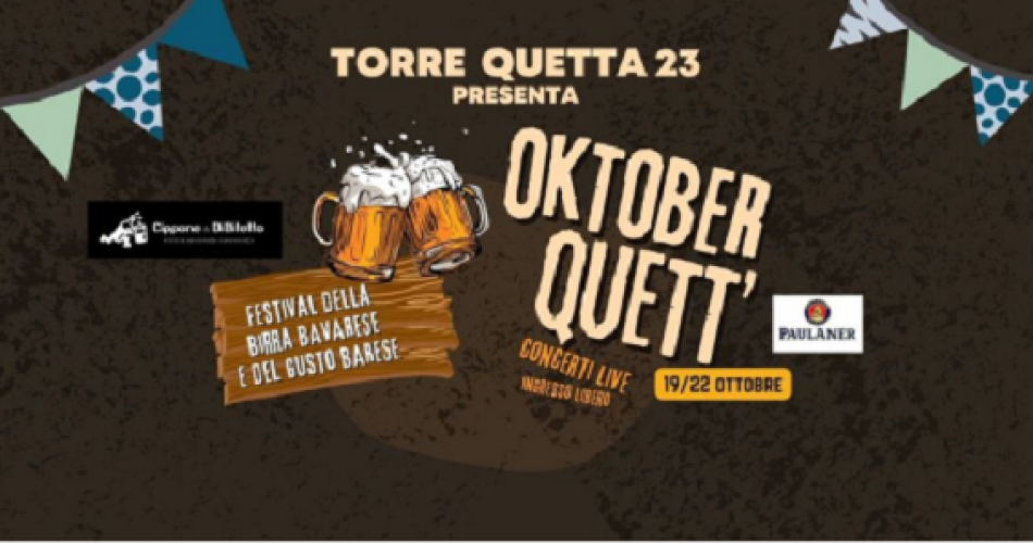 Tra gli eventi speciali di ottobre segnaliamo per il questo fine settimana, dal 19 al 22 ottobre Oktober Quett. L’evento organizzato da Christian Calabrese in partnership con i gestori di alcuni dei chioschi di Torre Quetta prevede una 4 giorni dedicata alla Birra bavarese che si fonderà con pietanze tipiche baresi e non solo.