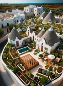 Un futuro, quello che si vede nelle immagini, a tratti surreale paragonato al periodo attuale, ma non troppo lontano, almeno per alcune questioni, da quelli che sono i progetti, soprattutto in merito al verde, come ad esempio con i boschi verticali o alla sostenibilità, con i pannelli solari posizionati addirittura sui lembi di sabbia. Ci sono poi situazioni molto all’avanguardia, come le ferrovie e i treni, collocati in spazi dalle architetture completamente moderne che si fondono con la tipicità della Puglia. Non mancano i trulli,