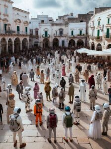 Non mancano i trulli, ma anche i pannelli fotovoltaici, i mercatini natalizi in chiave “moderna” e infine, i centri storici in cui, tra il bianco tipico delle case e delle chianche, spicca la presenza di persone, presumibilmente turisti, vestiti da “astronauti”, con caschi, tute e zaini, pronti a visitare la Puglia come se stessero camminando ad altre gravità.