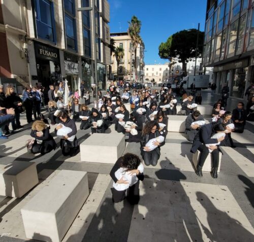 Vestiti di nero con un fagotto bianco tra le braccia per ricreare l’immagine di quella madre palestinese che stringe a sé, per l’ultima volta, il corpo esanime del suo bambino,…