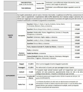 Tariffe predeterminate per percorsi prestabiliti: è stato ridotto il numero delle tariffe fisse predeterminate, essendo rimaste in vigore soltanto due categorie (aeroporto – quartieri e viceversa; stazione – località limitrofe alla città).Tali tariffe, definendo un importo prestabilito, onnicomprensivo di supplementi e invariabile, garantiscono una maggiore trasparenza del prezzo del servizio e una sicura convenienza in favore dell’utenza, circostanza riscontrata con le verifiche dei percorsi effettuate dalla Polizia locale; L’introduzione della categoria delle tariffe predeterminate per i collegamenti tra il centro città e gli altri quartieri è stata rinviata a seguito dell’espletamento delle indagini di mercato di cui al sopra citato punto 68 delle Linee guida.
