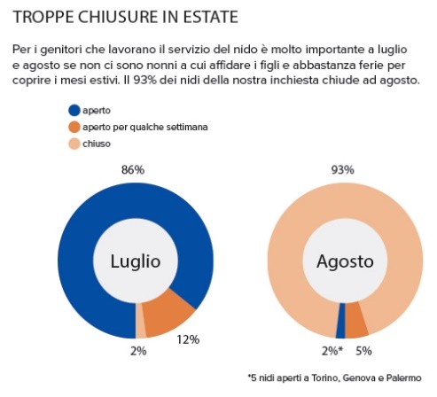 Altroconsumo si è rivolto alla community di ACmakers coinvolgendo mille intervistati, dai quali è emersa la necessità di ripensare i sistemi di welfare per le famiglie tenendo conto delle reali esigenze dei genitori italiani. Viste le politiche che allungano sempre di più la permanenza a lavoro, mamme e papà richiedono di investire per aumentare le strutture e i posti disponibili, norme che diano maggiore flessibilità lavorativa (congedi, permessi…) e un contributo diretto da parte dello Stato nel pagamento della retta, almeno in parte, per tutti. Oltre che la possibilità di essere supportati anche nel periodo estivo: dall’indagine condotta emerge che a luglio solo il 2% dei nido chiude del tutto, il 12% per qualche settimana, l’86% rimane aperto. Situazione completamente differente nel mese di agosto, durante il quale il 93% degli asili nido risulta essere chiuso.