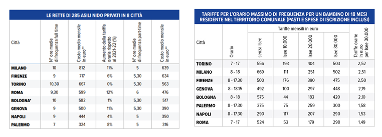 Rispetto all’inchiesta sulle tariffe dei nido privati di due anni fa per le città considerate le tariffe orarie sono aumentate in media dell’8,8%. A Roma, Milano e Genova l’aumento è stato più elevato, sopra l’11%. Torino e Bologna stabili.