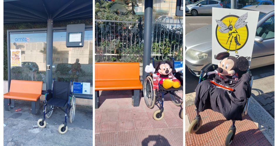 E così Topolino è stato messo sulla sedia a rotelle a dimostrazione di come si utilizzano davvero le nuove pensiline Amtab.