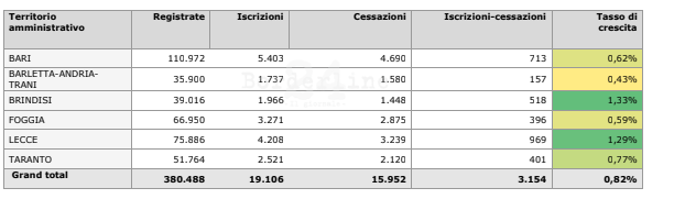 L’economia regionale nel 2023 ha fatto segnare andamenti positivi nella natimortalità aziendale. Il saldo fra le iscrizioni e le “cessazioni non d’ufficio” in Puglia è stato infatti di +3.154 imprese, con un tasso di crescita di +0.82%, il migliore del Sud Italia dopo la Campania (+1,04%). Anche a seguito di questo andamento, lo stock di imprese della regione al 31 dicembre 2023 si è posizionato su 380.488 aziende registrate.