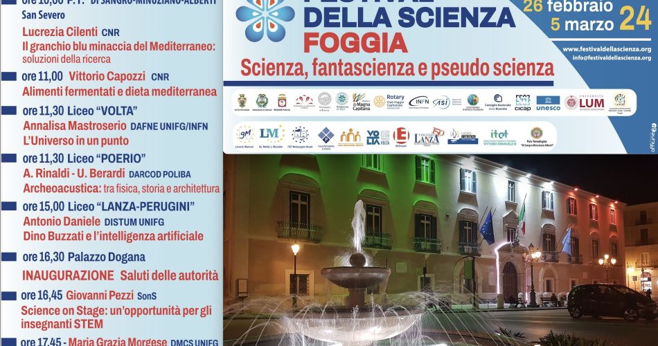 È tutto pronto per la giornata inaugurale del Festival della Scienza di Foggia. La seconda edizione comincerà lunedì 26 febbraio. Diversi gli appuntamenti già dal mattino. All’inaugurazione ufficiale, che si terrà alle ore 16.30 a Palazzo Dogana, interverranno: la sindaca di Foggia, Maria Aida Episcopo; l’assessore regionale al Welfare, Rosa Barone; i consiglieri provinciali delegati dal presidente della Provincia di Foggia, Giuseppe Nobiletti; i direttori dei Dipartimenti dell’Università di Foggia; il dottor Potito Salatto, del Gruppo Salatto, main sponsor del Festival della Scienza. Oltre ad Antonio Milazzi, Angelo Bricocoli e Marco D’Alessandro, organizzatori dell’importante rassegna divulgativa, scientifica e culturale, saranno inoltre presenti i delegati di ciascun partner del Festival.