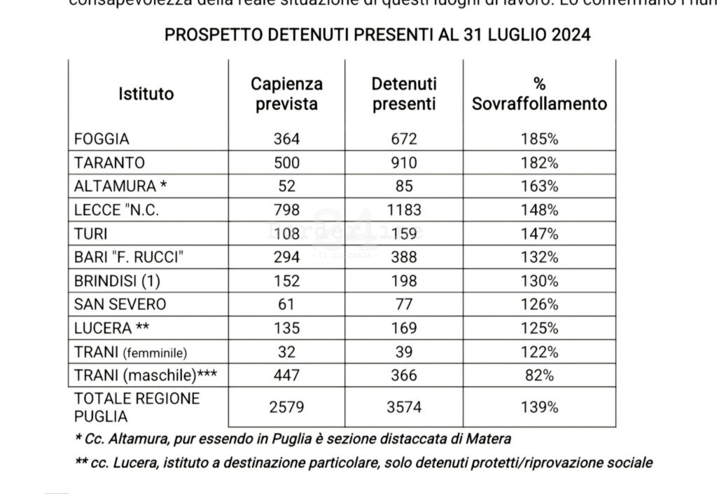 Per quanto riguarda le carenze di personale è sufficiente riportare i dati di alcuni istituti, a partire dal carcere di Bari dove in organico sono previsti 258 unità per una capienza di 294 detenuti, mentre ne abbiamo in servizio solo 221 a fronte di 388 detenuti; il carcere di Foggia che ha un sovraffollamento quasi doppio, con una capienza di 364 sono presenti ben 672 detenuti, mentre il personale in servizio è sotto le 240 unità, quando invece per il numero di detenuti presenti l’organico dovrebbe essere praticamente il doppio; stessa situazione di Foggia si verifica al carcere di Taranto, con un organico dimezzato rispetto ai detenuti presenti. È evidente che con questi numeri la situazione diventa esplosiva. Ed è esattamente quello che è accaduto oggi. Una rivolta che ha visto protagonisti detenuti, che ha coinvolto poliziotti penitenziari feriti nell’adempimento del loro dovere, e addirittura un infermiere sequestrato.