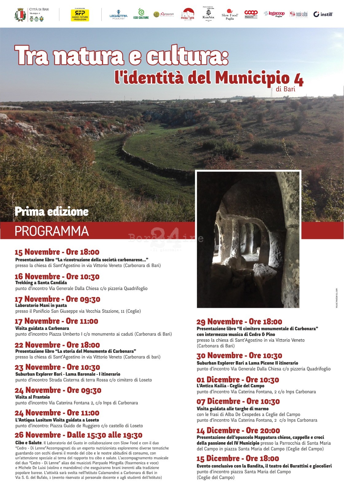 Portare la periferia al centro scoprendola, raccontandola e gustandola: questo è l’obiettivo di “Tra natura e cultura”, una rassegna di eventi gratuiti che punta al rafforzamento dell’identità del Municipio IV di Bari. Di questi temi si è parlato questa mattina, nel corso della conferenza stampa di presentazione della prima edizione dell’iniziativa, che da venerdì prossimo, 15 novembre, e fino al 15 dicembre, accenderà i riflettori sui quartieri di Carbonara, Ceglie e Loseto che diventeranno teatro di visite guidate, momenti musicali, presentazioni di libri, escursioni e laboratori del gusto, attività che vogliono far conoscere un territorio ricco di bellezza e dalle grandi potenzialità.