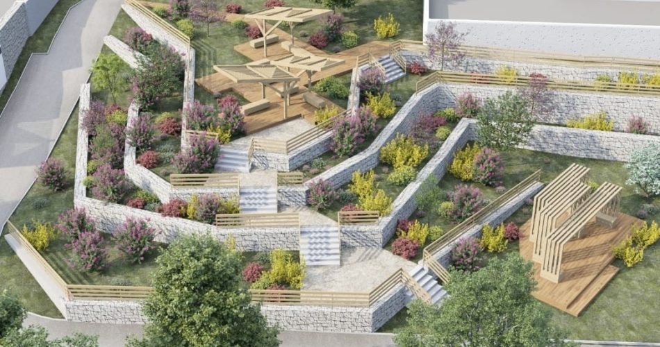 Il livello più in basso delle terrazze ospiterà un’attività di ristorazione con sosta all’aperto sotto i pergolati e una zona bar, perimetrata da vetrate panoramiche antivento. Anche le terrazze sono attrezzate con sedute in modo tale da agevolare la sosta in un’area che ha una vista privilegiata sul parco reticolare e verso il mare, da questo punto pienamente godibile. Gli arredi, in analogia con gli altri spazi del parco, saranno di tipo monolitico, con finitura in pietra. Le essenze erbacee si troveranno in misura prevalente lungo i terrazzamenti e quelle arboree e arbustive sia negli spazi di margine che nelle piazzette. Nello specifico si è attribuita ad ogni piazzetta una prevalente specie arborea in modo tale da caratterizzare in modo diverso ogni spazio aperto.