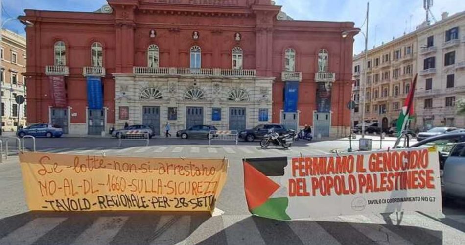 • il corteo passerà davanti la Presidenza della regione Puglia su lungomare Nazario Sauro per denunciare la complicità delle istituzioni, che non solo continuano a non prendere posizione sul genocidio in Palestina ma che sostengono, attraverso mille fili, Israele con rapporti militari, industriali, turistici, culturali che permettono ad Israele ad avere in Puglia solidi appoggi e solidi legami.