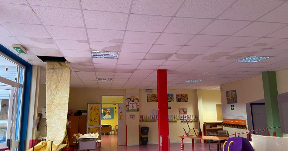 “Non ci saranno ripercussioni sull’andamento scolastico – assicura il sindaco Angarano – Le lezioni riprenderanno regolarmente domani e, come convenuto con la Dirigenza Scolastica, i bimbi delle tre sezioni che usufruivano della sala mensa per la refezione scolastica consumeranno i pasti nelle rispettive aule fino alla sostituzione di alcuni pannelli di cartongesso, prevista comunque già nella giornata di domani”: (foto facebook sindaco Angarano)