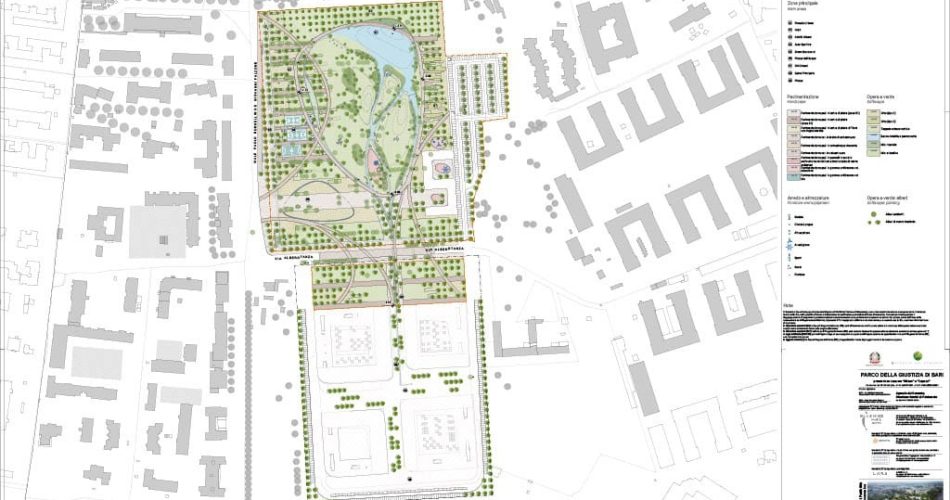 Il parco verde previsto dal progetto “Parco della Giustizia di Bari”, con i suoi 10 ettari circa, sarà per estensione il più grande parco urbano di Bari con oltre 900 alberi, tra nuove piantumazioni e recupero di quelle esistenti.