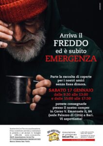 Emergenza freddo a Bari, si cercano giubbotti e coperte per i più fragili e i senza dimora. L’iniziativa è organizzata dai volontari dell’associazione In.Con.Tra che sabato 17 gennaio, dalle ore 9.30 alle ore 17.30 hanno organizzato una raccolta dedicata in corso Vittorio Emanuele, nei parcheggi antistanti al Comune di Bari, con il camper utilizzato per l’unità di strada. “Vi aspettiamo numerosi – scrivono – per aiutarci a fronteggiare l’emergenza freddo”, concludono.