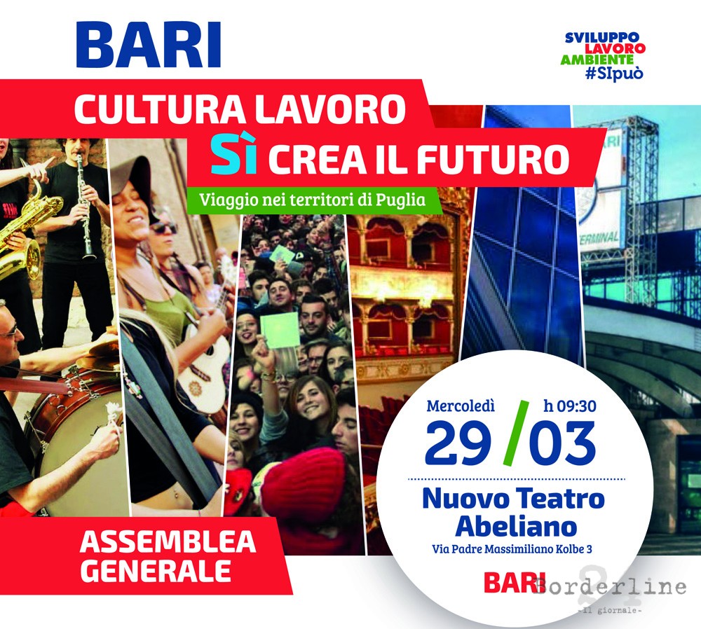 “BARI, CULTURA, LAVORO: SÌ CREA IL FUTURO”, è il titolo della iniziativa con Susanna Camusso, in programma a Bari il 29 marzo nel Teatro Abeliano, come declinazione barese del viaggio nei territori di Puglia. Sviluppo, lavoro, ambiente sono i temi della piattaforma elaborata dalla Cgil pugliese con le Camere del Lavoro e le categorie, contenuti […]