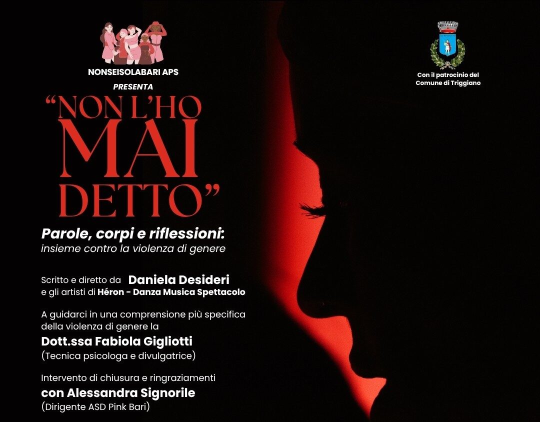 Il 26 novembre, alle 20, la Casa della Cultura “Rocco Dicillo” di Triggiano ospiterà “Non l’ho mai detto”, l’evento promosso dall’associazione NONSEISOLABARI APS e dedicato a un racconto collettivo contro la violenza di genere. Una serata pensata come un viaggio emotivo fatto di parole, corpi e riflessioni, scritta e diretta da Daniela Desideri, con la […]