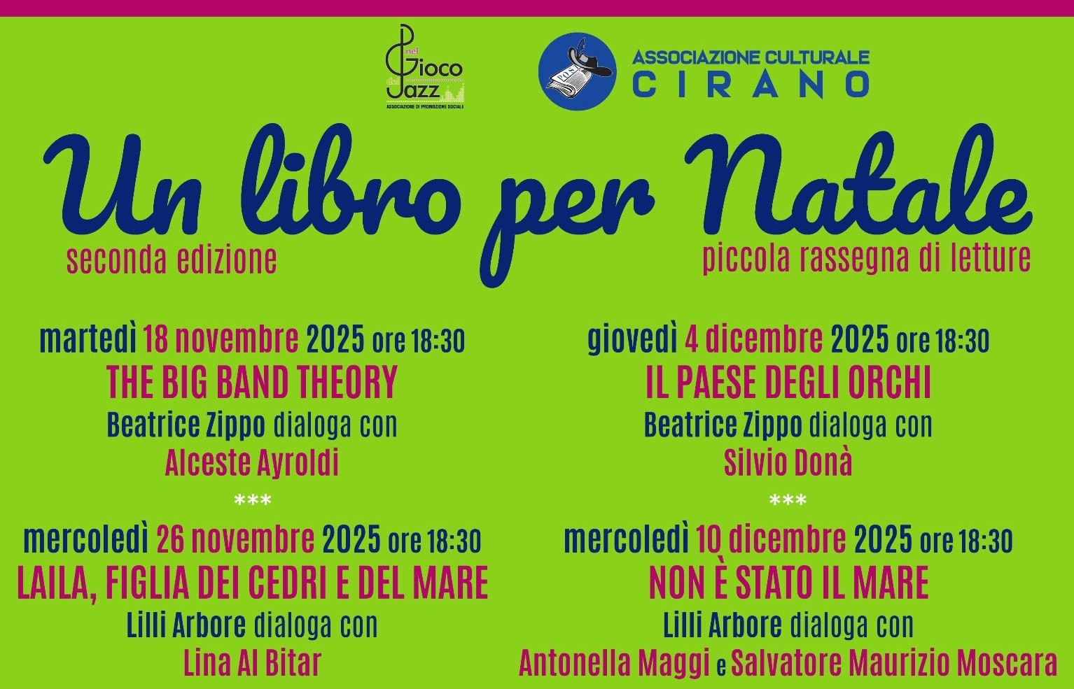 Dopo il successo della scorsa edizione, torna a Bari “Un libro per Natale”, la mini rassegna letteraria ideata e curata dall’Associazione Cirano, presieduta da Franco Muciaccia, in collaborazione con l’Associazione “Nel Gioco del Jazz” guidata da Donato Romito. L’obiettivo è lo stesso: proporre libri capaci non solo di diventare regali natalizi perfetti, ma anche di […]