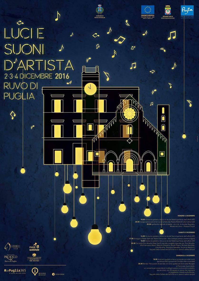 “Luci e suoni d’artista” è un progetto dell’assessorato alla Cultura del Comune di Ruvo finanziato dalla Regione Puglia nell’ambito del programma regionale di Puglia Promozione “Semplicemente Puglia”. Il ricco programma della tre giorni (dal 2 al 4 dicembre) messo a punto dall’assessorato prevede un itinerario di luci d’artista con sculture luminose che percorrerà il centro storico di […]