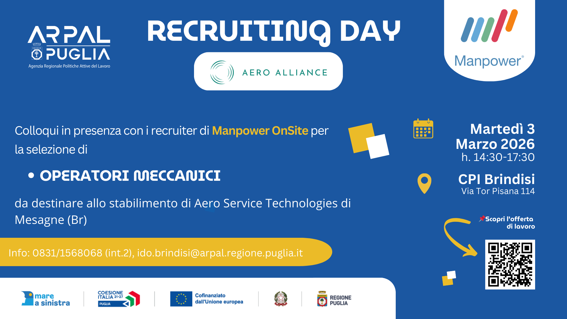 Martedì 3 marzo presso la sala convegni del Palazzo della Regione Puglia in via Tor Pisana 114, a Brindisi, si svolgerà il recruiting day organizzato da Arpal Puglia in collaborazione con Manpower per Aero Alliance, azienda leader per la fornitura di motori, ricambi e manutenzione in prodotti aeroderivati Si ricercano operatori meccanici. Si offre iniziale […]