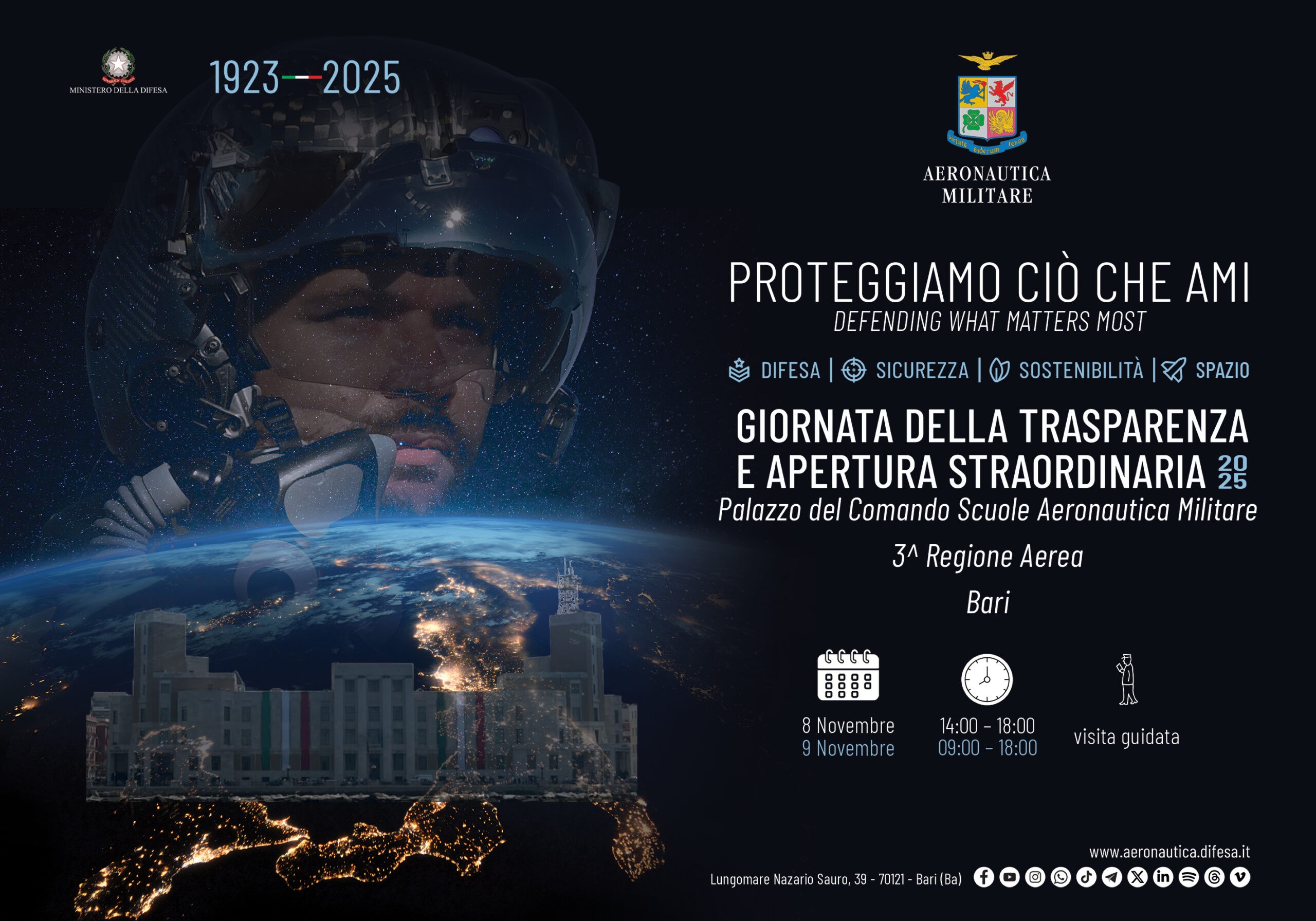 In occasione della Giornata della Trasparenza, il Palazzo storico del Comando Scuole dell’Aeronautica Militare di Bari, sito in Via Lungomare Nazario Sauro, 39 sarà visitabile sabato 08 e domenica 09 novembre 2025. Un’iniziativa che unisce la storia, la cultura e l’architettura in un unico e affascinante percorso che si snoderà attraverso saloni, fotografie e video storici che racconteranno l’evoluzione della Forza Armata e […]
