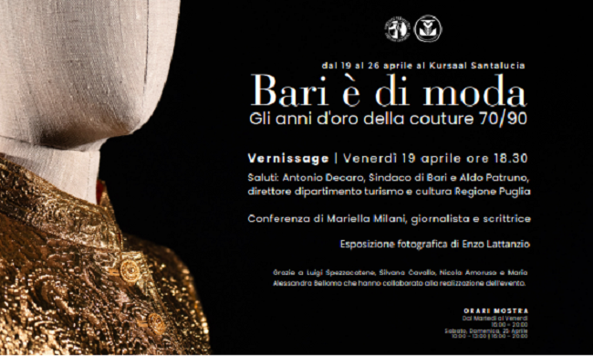 Un nuovo evento espositivo intitolato Bari è di moda – Gli anni d’oro della couture 70/90 riunirà, per la prima volta nella sala Giuseppina del Kursaal Santalucia, le creazioni di alcuni dei più grandi stilisti di moda. Si tratta di un’accurata selezione di abiti firmati da Roberto Capucci, Krizia, Yves Saint Laurent, Karl Lagerfeld – […]