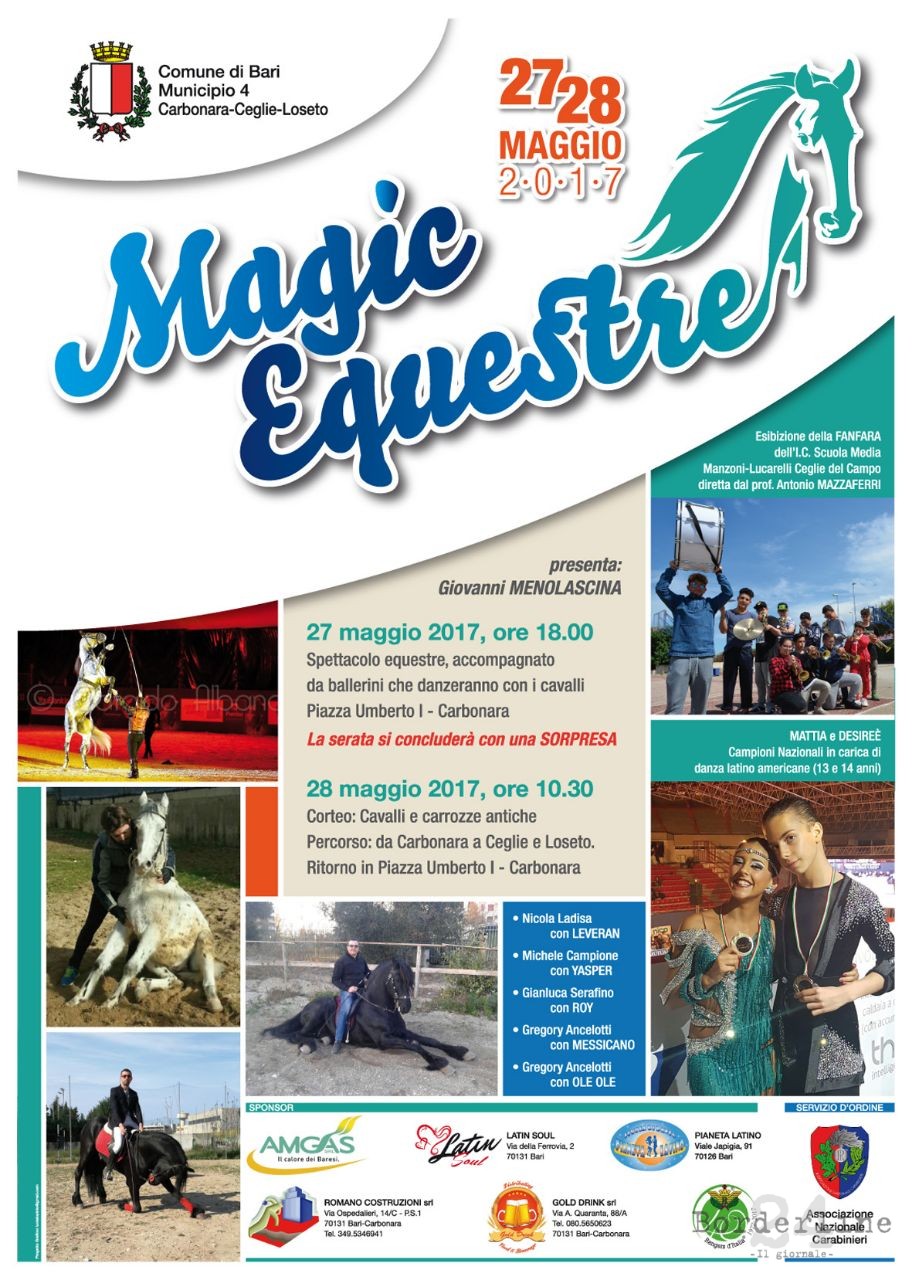 Anche oggi, in piazza Umberto I, a Carbonara, torna “Magic Equestre”, lo spettacolo, accompagnato da ballerini che danzeranno con i cavalli, che culminerà con il corteo di cavalli e carrozze antiche. L’iniziativa, che è patrocinata dal IV Municipio, si inserisce nel programma di eventi del Maggio barese ed è stata presentata a Palazzo di Città […]