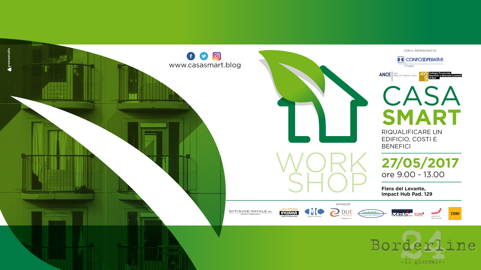 Si terrà sabato 27 maggio a Bari, presso l’Impact Hub (PAD. 129) della Fiera del Levante a partire dalle ore 9.00, il workshop dal titolo “Riqualificare un edificio, costi e benefici” organizzato dal blog Casa Smart. All’incontro relazioneranno l’architetto Beppe Fragasso, Presidente dell’Ance Bari-Bat, Vito Lucente, vice-presidente nazionale di AMi, Bellisario Masi, Presidente di FederAbitazione […]