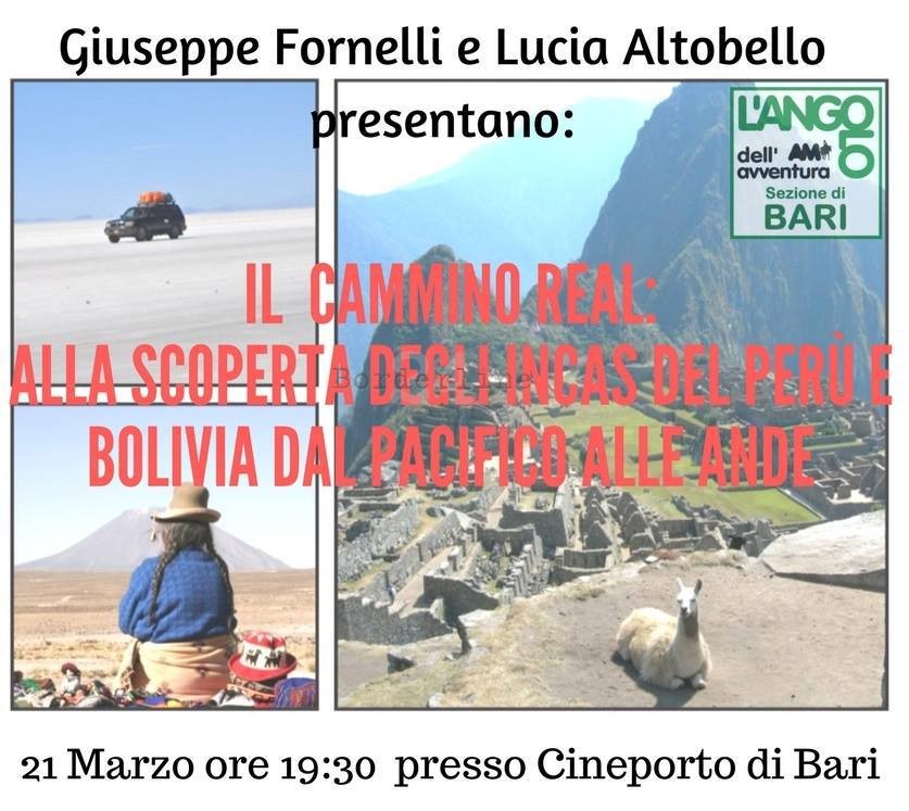 Mercoledì 21 marzo, alle 19 e 30, al Cineporto di Bari (Fiera del Levante di Bari, padiglione 180, sede Apulia Film Commission, lungomare Starita, 1, ingresso Monumentale, a fianco Eataly), l’Angolo dell’Avventura di Bari organizza un nuovo racconto di viaggio: “Perù e Bolivia”. Giuseppe Fornelli e Lucia Altobello, viaggiatori e coordinatori di Avventure nel Mondo, racconteranno con le loro […]