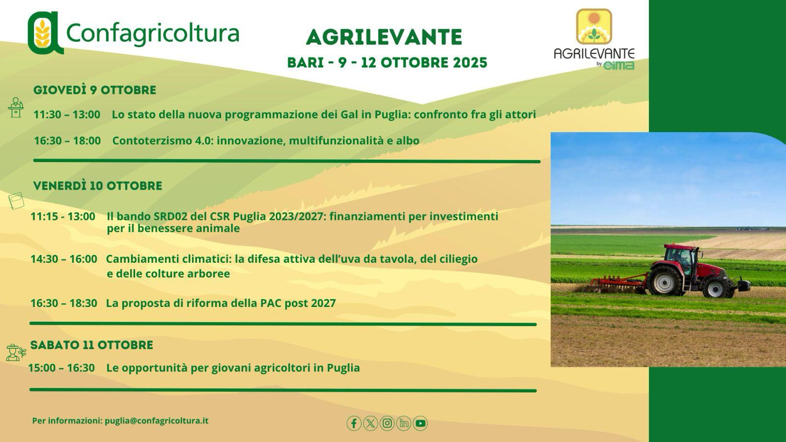 Dal 9 al 12 ottobre 2025, torna a Bari Agrilevante, la più importante manifestazione fieristica dedicata all’agricoltura del Mediterraneo, punto di riferimento per imprese, istituzioni e professionisti del settore. Un appuntamento strategico per discutere di innovazione, sviluppo rurale e delle nuove sfide legate alla transizione ecologica e digitale in agricoltura. Anche Confagricoltura Bari-Bat sarà presente […]