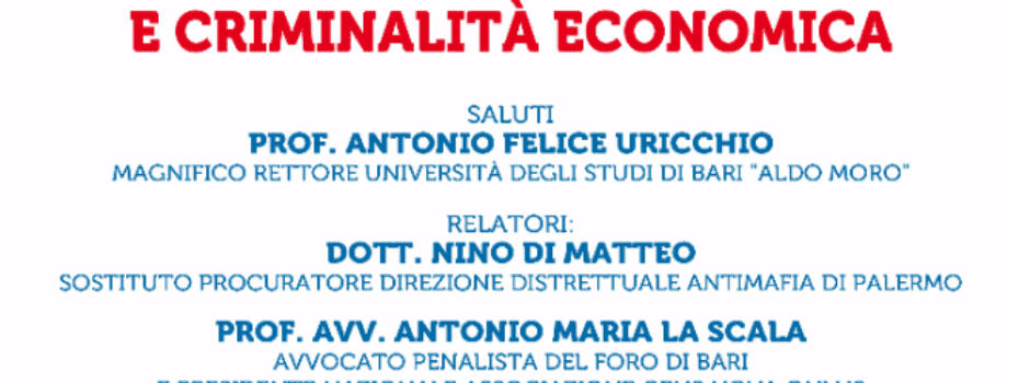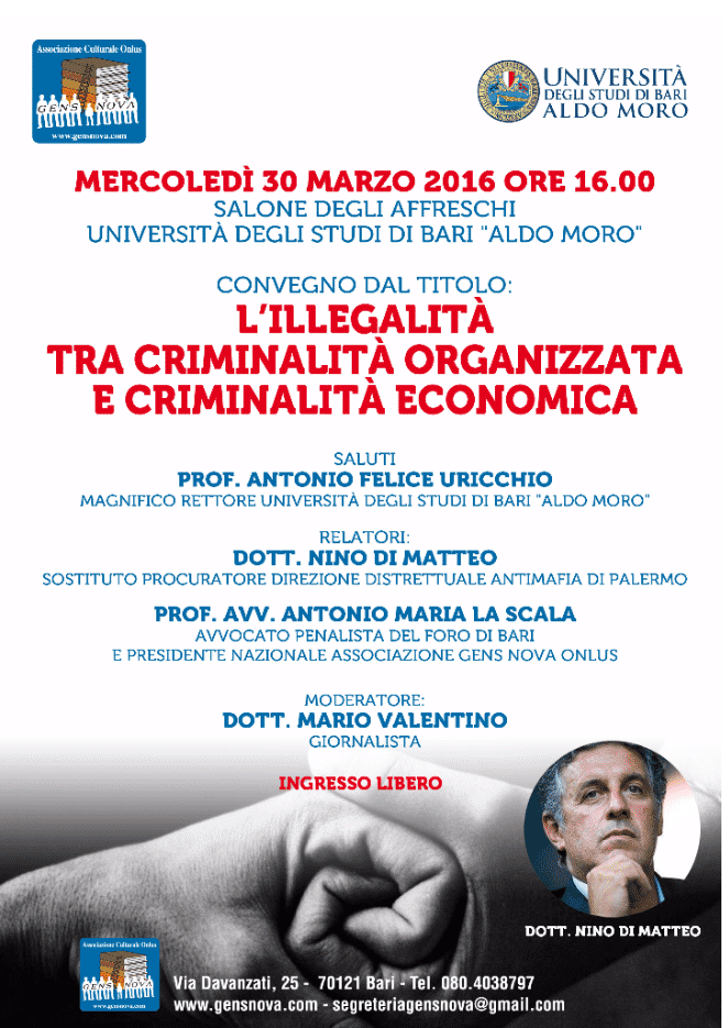 Nino Di Matteo, sostituto procuratore della Direzione Distrettuale Antimafia di Palermo, sarà ospite di una conferenza, intitolata “L’illegalità tra criminalità organizzata e criminalità economica”. L’incontro, previsto per il 30 marzo alle 16 nel Salone degli Affreschi dell’Università degli Studi di Bari, è stato organizzato dall’associazione Gens Nova e sarà aperto dal rettore dell’Università di Bari, […]