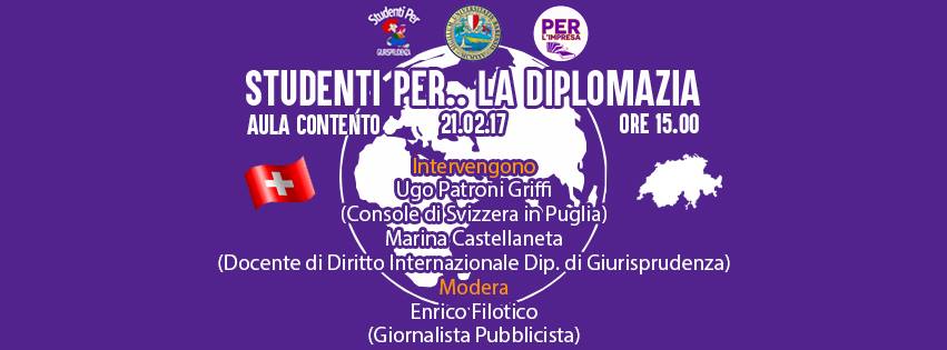 Comincerà il prossimo 21 febbraio nell’aula Contento del Dipartimento di Giurisprudenza di Bari il ciclo di incontri dal titolo ‘Studenti PER…la diplomazia’, una kermesse di eventi dedicati agli amanti del Diritto internazionale, organizzata dall’associazione studentesca “Studenti per… Giurisprudenza”. Quattro conferenze durante le quali si avvicenderanno diplomatici e ambasciatori, affiancati da docenti della materia e moderati […]