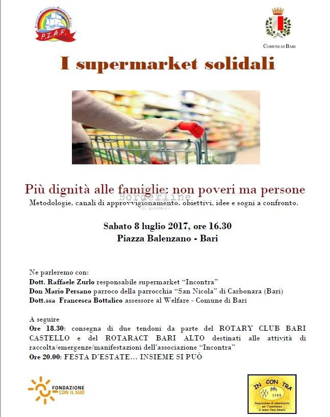 “Più dignità alle famiglie: non poveri ma persone. Metodologie, canali di approvvigionamento, obiettivi, idee e sogni a confronto”. Questo il tema che sarà dibattuto nell’evento “I supermarket solidali”, sabato 8 luglio, in piazza Balenzano a Bari. Interverranno il dott. Raffaele Zurlo, responsabile supermarket “Incontra”, don Mario Persano, parroco della parrocchia “San Nicola” di Carbonara (Bari), […]