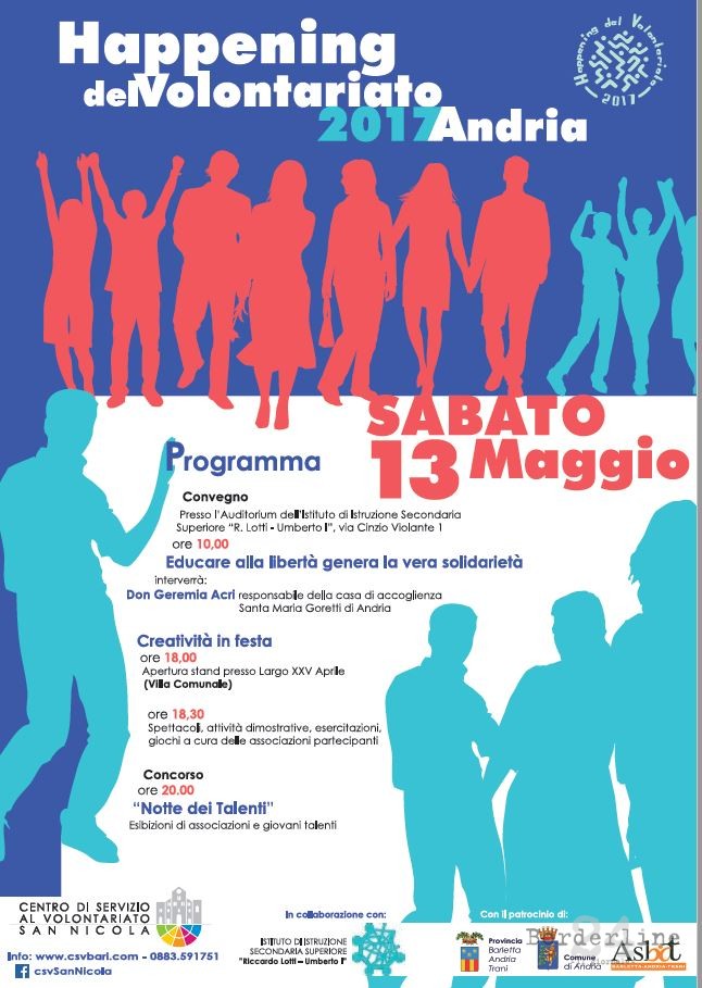 Riparte sabato 13 maggio da Andria, con l’Happening del Volontariato, il cammino delle associazioni di volontariato della provincia di Bari e Bat per incontrare la gente e diffondere la cultura del dono e della solidarietà, dell’impegno attivo, dell’amicizia. Ma l’obiettivo è anche di parlare di buone pratiche, quelle messe in campo dalle libere associazioni dei […]