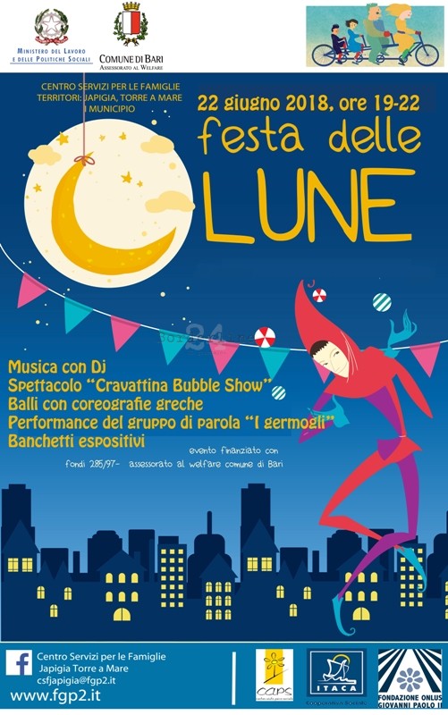 Si terrà oggi, venerdì 22 giugno, dalle ore 19 alle 22, nel Centro servizi per le famiglie di Japigia, in via Giustina Rocca 9, la terza edizione della “Festa delle Lune”, l’appuntamento estivo per dare il via all’estate con le famiglie, i ragazzi e le ragazze, i bambini e le bambine che frequentano la struttura. […]