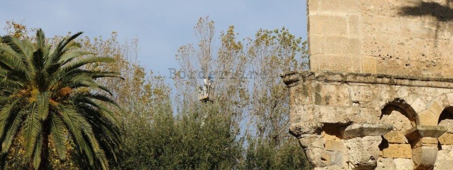 Potatura ad altezza elevata tra gli alberi del giardino Isabella D’Aragona. Come mostra la foto, a pochi passi dal Castello Svevo, questa mattina gli operai comunali hanno proseguito nelle operazioni di restyling all’interno dell’area verde cantierizzata, in cui lo scorso 13 ottobre sono stati piantati oltre 50 nuovi lecci.