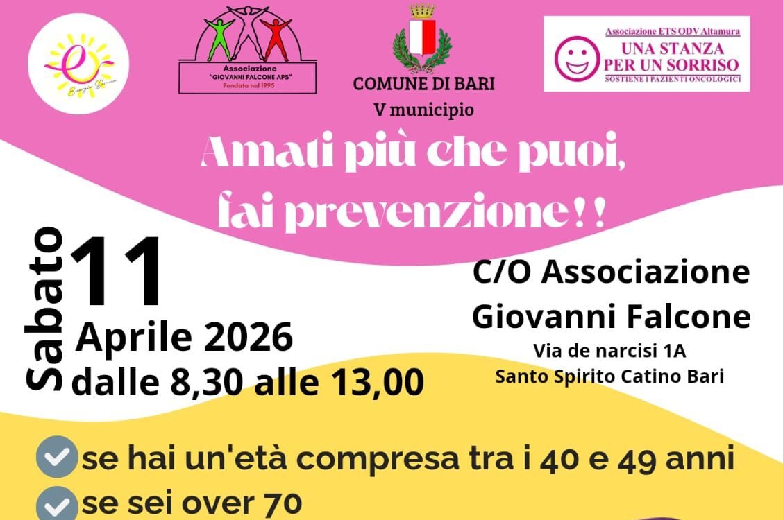 Una mattinata dedicata alla prevenzione e alla salute delle donne. Sabato 11 aprile 2026, dalle 8.30 alle 13.00, a Catino (quartiere a nord di Bari), sarà possibile effettuare controlli senologici gratuiti. L’iniziativa si svolgerà presso la sede dell’associazione “Giovanni Falcone APS”, in via De Narcisi 1A, ed è promossa con il supporto del V Municipio […]