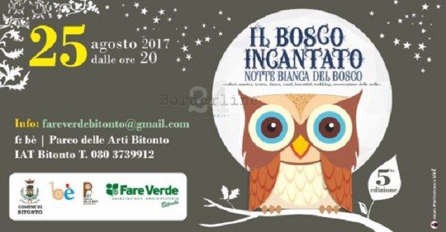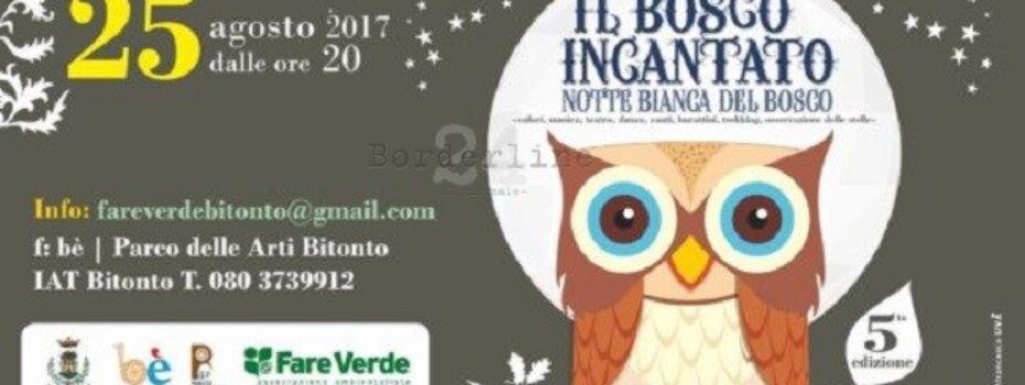 Si svolgerà domani (venerdì 25 agosto) la quinta edizione della Notte Bianca del Bosco, organizzata dal Comune di Bitonto (Assessorato al marketing territoriale) e dalla sezione bitontina dell’Associazione ambientalista Fare Verde Puglia. All’evento, uno dei più attesi del nutrito programma dell’estate bitontina, vantando pochi esempi simili in tutta Italia, è prevista, come per le passate […]