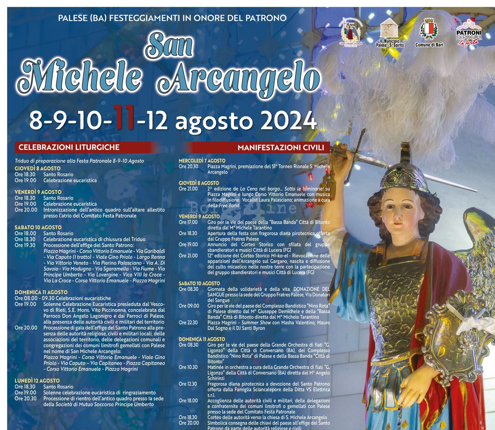 A Palese torna l’atteso appuntamento con la festa patronale dedicata a San Michele Arcangelo che quest’anno si terrà dall’8 agosto sino al 12 con un ricco programma. Tanti le attrazioni, tra queste le giostre, ma anche concerti, musica e arte. Si parte giovedì 8 Agosto con la 2^ edizione de La Cena nel borgo… Sotto […]